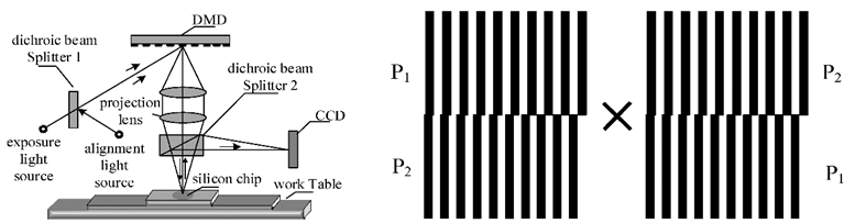 (a) DMD数字光栅对准系统 (b) 数字光栅对准标记
