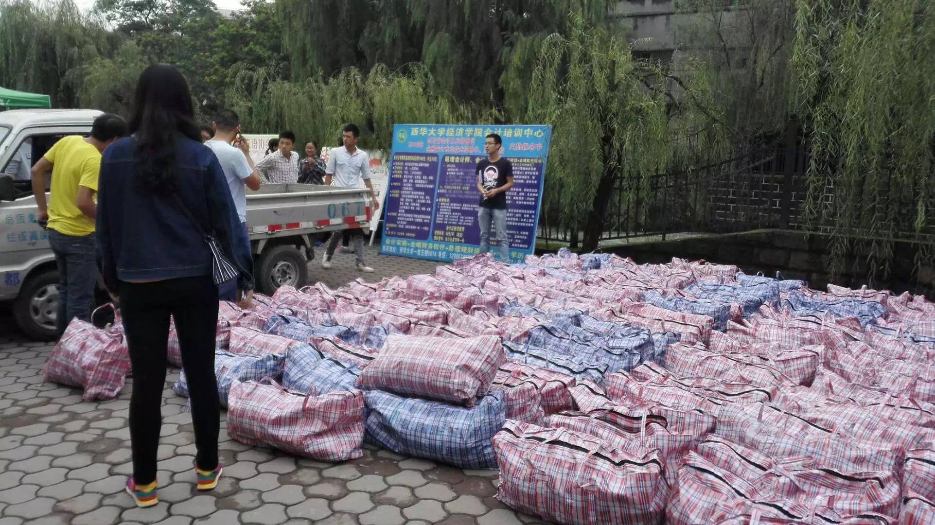 23日一早,志愿者们就在临江苑和德馨苑进行了摆点及活动前期的准备。10点左右,陆续有大一的新生们来到捐赠点捐赠军训服装。为提高活动效率,部分志愿者深入寝室统一收集衣服,放置到捐赠点。