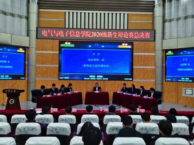11月27日晚,伟德国际1946在四教报告厅举办2020级新生辩论赛决赛,辩题为“爱情是生活的调味料还是主旋律”。电信4班作为正方,论点为“爱情是生活的调味料”,电气2班作为反方。比赛由学院学习部干事曾雨航主持,学生会副主席李奇遥、主席罗旭、李艳月作为嘉宾到场观看。电气学院 18级校辩论队辩手吴凌霄、17级李林静及其他学院辩论队领队,作为评委到场观摩。