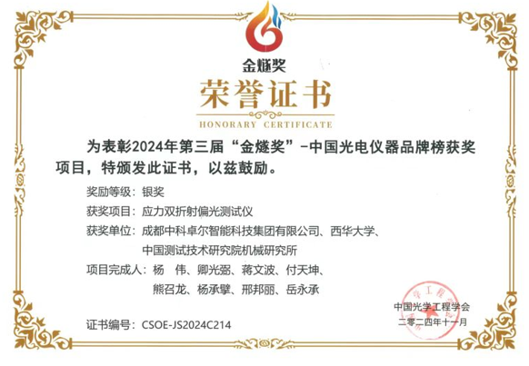 近日,伟德国际1946蒋文波教授为主要完成人,联合成都中科卓尔智能科技集团有限公司、中国测试技术研究院机械研究所共同研制的“应力双折射偏光测试仪”荣获2024年度第三届“金燧奖”中国光电仪器品牌榜银奖。
