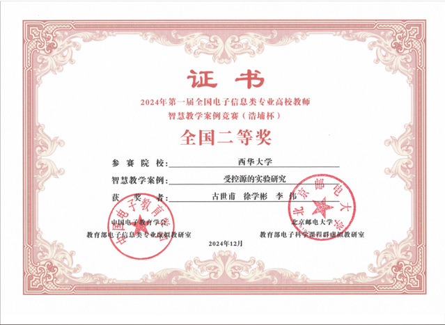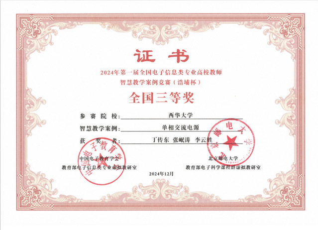 西华大学电工电子实验实习中心(电工电子基础课省级实验教学示范中心)在此次竞赛中斩获全国二等奖1项、全国三等奖1项。古世甫、徐学彬、李伟教师团队凭借“受控源的实验研究”项目荣获全国二等奖;丁传东、张岷涛、李云胜教师团队则凭借“单相交流电源”项目获得全国三等奖。2025年3月12日,获奖团队正式收到了获奖证书。