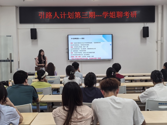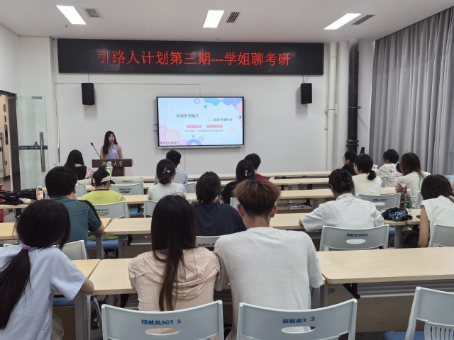 随后,陈丽娜学姐以《从西华到福大:我的考研历程》为主题,从目标规划、学习策略到心态管理三个方面,详细讲述了自己的考研之路。她强调,精准定位目标院校与专业是考研成功的第一步,同时分享了高效的时间管理方法和实用的备考技巧,鼓励同学们保持积极心态,稳步前行。