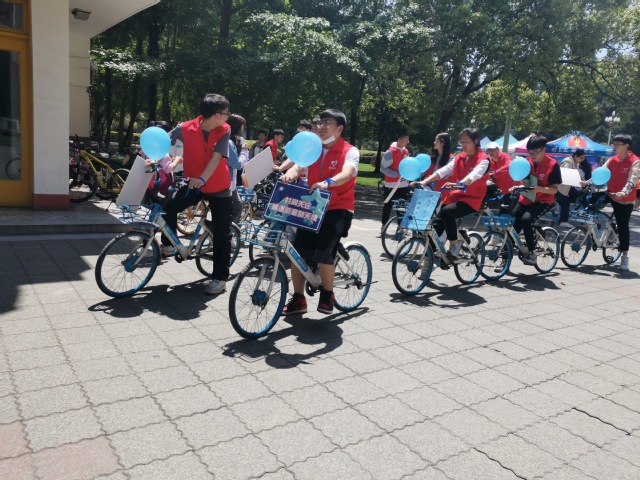 下午进入到活动第二环节,“蓝”骑行活动,八位志愿者骑着系有蓝色丝带和蓝气球的单车,按照明德广场--西华苑--四食堂--图书馆--临江操场--临江苑--二食堂--明德广场的路线,对本次活动进行了进一步的宣传,使更多的人对自闭症有了了解。