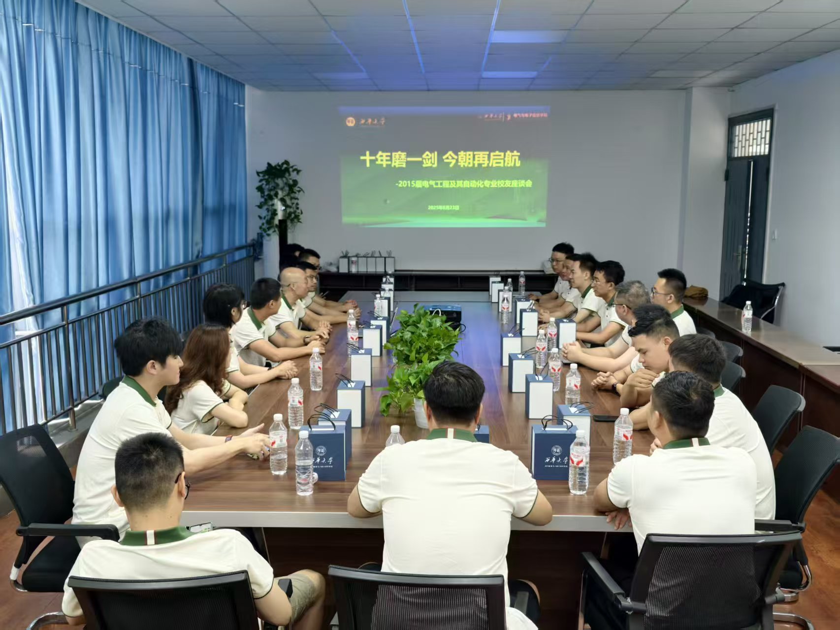 2025年8月23日上午,学院举行2011级电气工程及其自动化专业校友毕业十周年“十年磨一剑 今朝再起航”师生座谈会。本次活动校友们从全国各地重返校园,追忆青葱岁月,共叙青春年华。学院党委副书记郭忠林、原2011级辅导员张帆共同参与本次活动,座谈会由2011级校友张跃鑫主持。