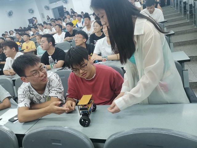 创新实验室的主讲人在开场时提出:“如果你能因热爱学习而加入实验室,那么你会发现实验室里全是志同道合的朋友。”并举以平衡小车、避障小车、循迹小车等多种制作成品向大家展示了实验室浓厚的学习氛围,结合带到现场的一辆自制的“平衡小车”,提出实验室强调“学无止境”的精神面貌。