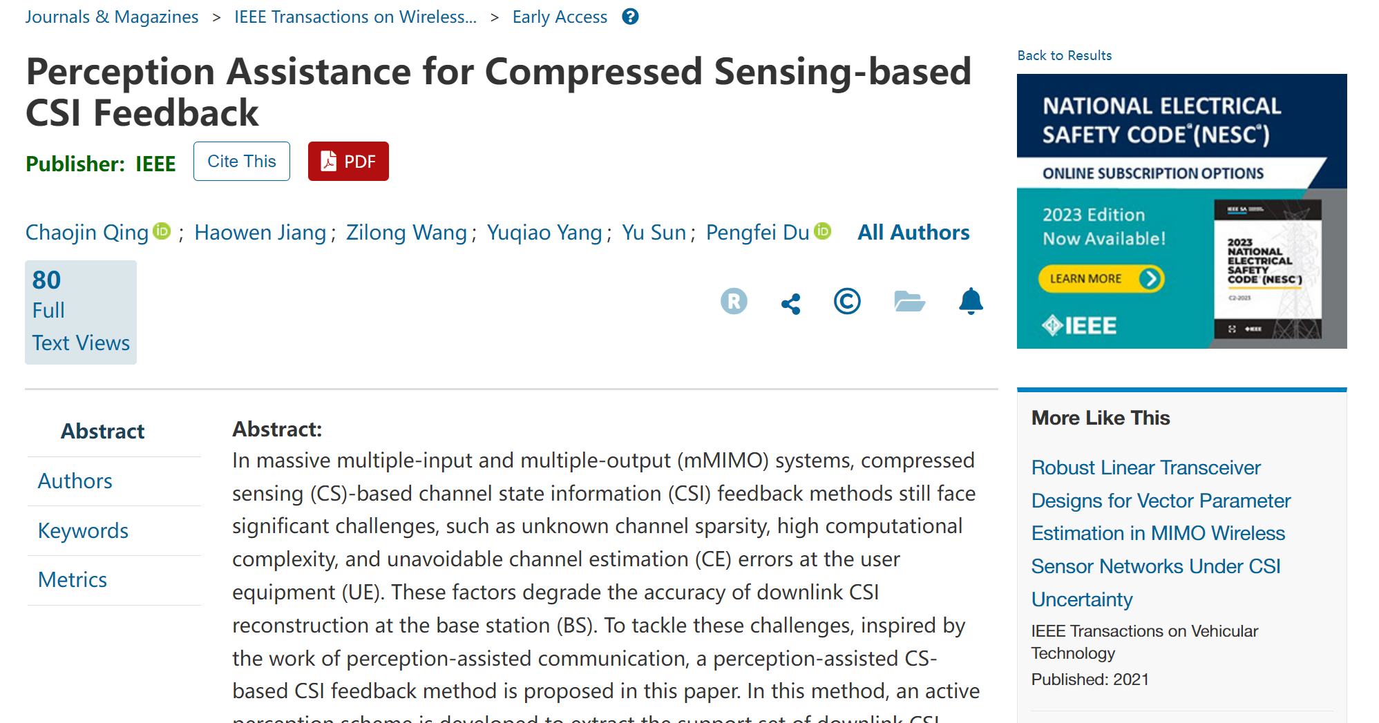 为“Perception Assistance for Compressed Sensing-based CSI Feedback”与“Environmental Sensing-assisted Off-grid Channel Estimation in UAV-enabled OTFS-ISAC Systems”的研究论文。此外,团队近来还在多个知名期刊上连续发表多项成果,包括《IEEE Transactions on Vehicular Technology》(中科院SCI二区TOP期刊)的 “Timing Synchronization in UAV-assisted OFDM Systems Utilizing Sensing Prior Information”、《Signal Processing》(中科院SCI二区期刊)的“Sensing-assisted CSI Feedback by Leveraging Communication Echoes”、以及《IEEE Transactions on Green Communications and Networking》(中科院SCI二区期刊)的“Perception Service-aided Channel Estimation in Wireless Communication Systems”。