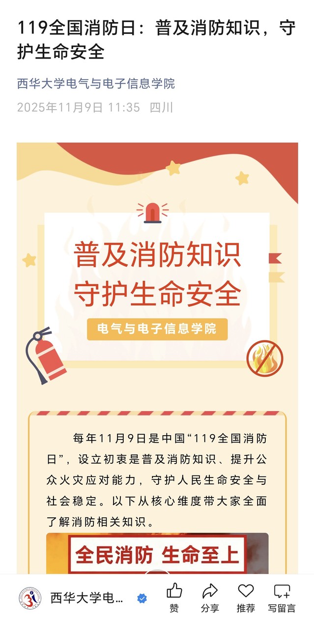 学院通过微信公众号发布推文,进一步提高学院师生的消防安全意识,普及了更多消防安全知识。