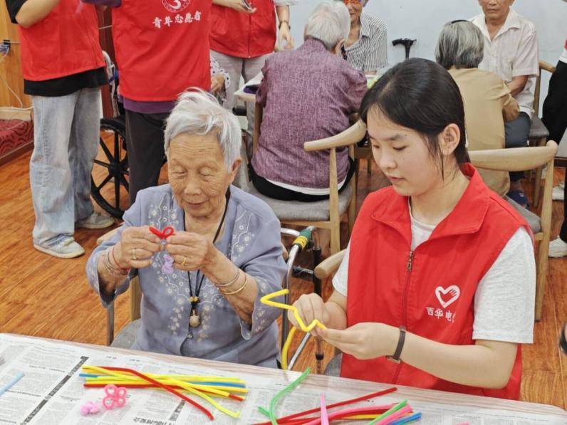 电气学院志愿者们全部到达青孝颐养中心后,表演了《感恩的心》舞蹈,之后合唱了《明天会更好》歌曲节目。随后志愿者们用自带的各色扭扭棒与老人们一同完成许多手工作品。