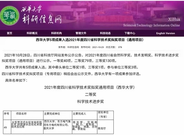 近日,伟德国际1946,Bevictor伟德,伟德官网范镇南副教授凭借“大型贯流式水轮发电机阻尼系统健康状态优化关键技术及应用”与“大型贯流式水轮发电机阻尼系统故障抑制关键技术及其应用”两项成果,分别荣获“四川省科技进步二等奖”与“中国机械工业科学技术奖科技进步”三等奖的表彰。