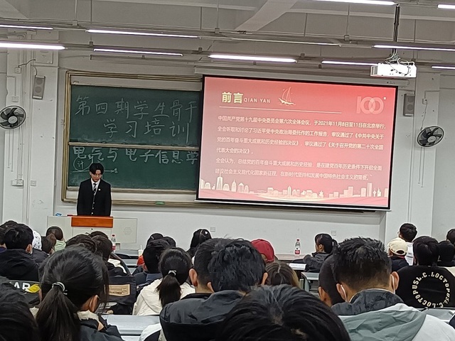 随后,由大二宣讲团成员刘鑫学长为大家讲述了党的十九届六中全会主要指导思想,包括党的发展历史、壮大史和现代党对学生骨干们所做出的要求等。