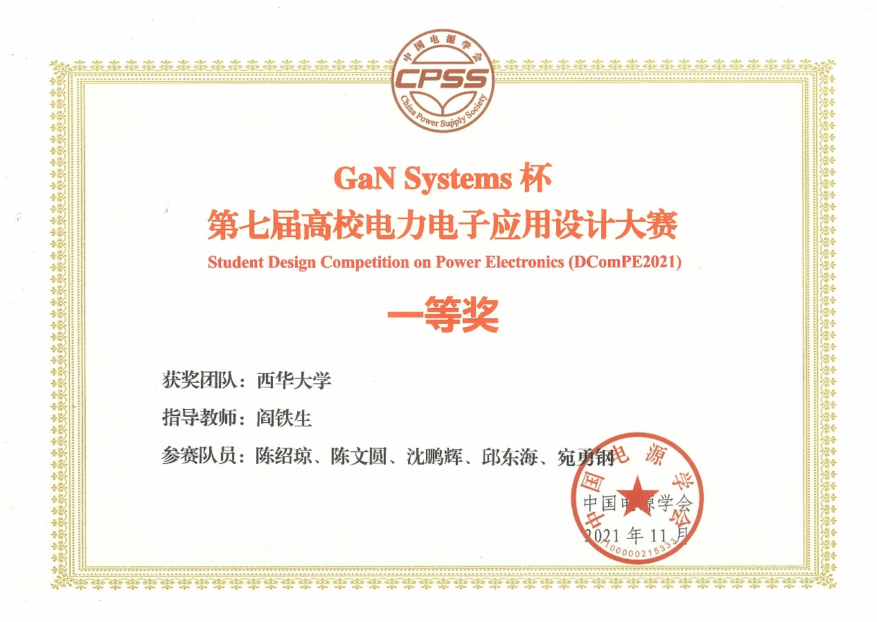 近日,由中国电源学会主办的GaN Systems杯第七届高校电力电子应用设计大赛决赛在上海市成功举行,由我校伟德国际1946陈绍琼、陈文圆、沈鹏辉、邱东海、宛勇钢组成的参赛队伍荣获一等奖,充分展现了西华学子风采。