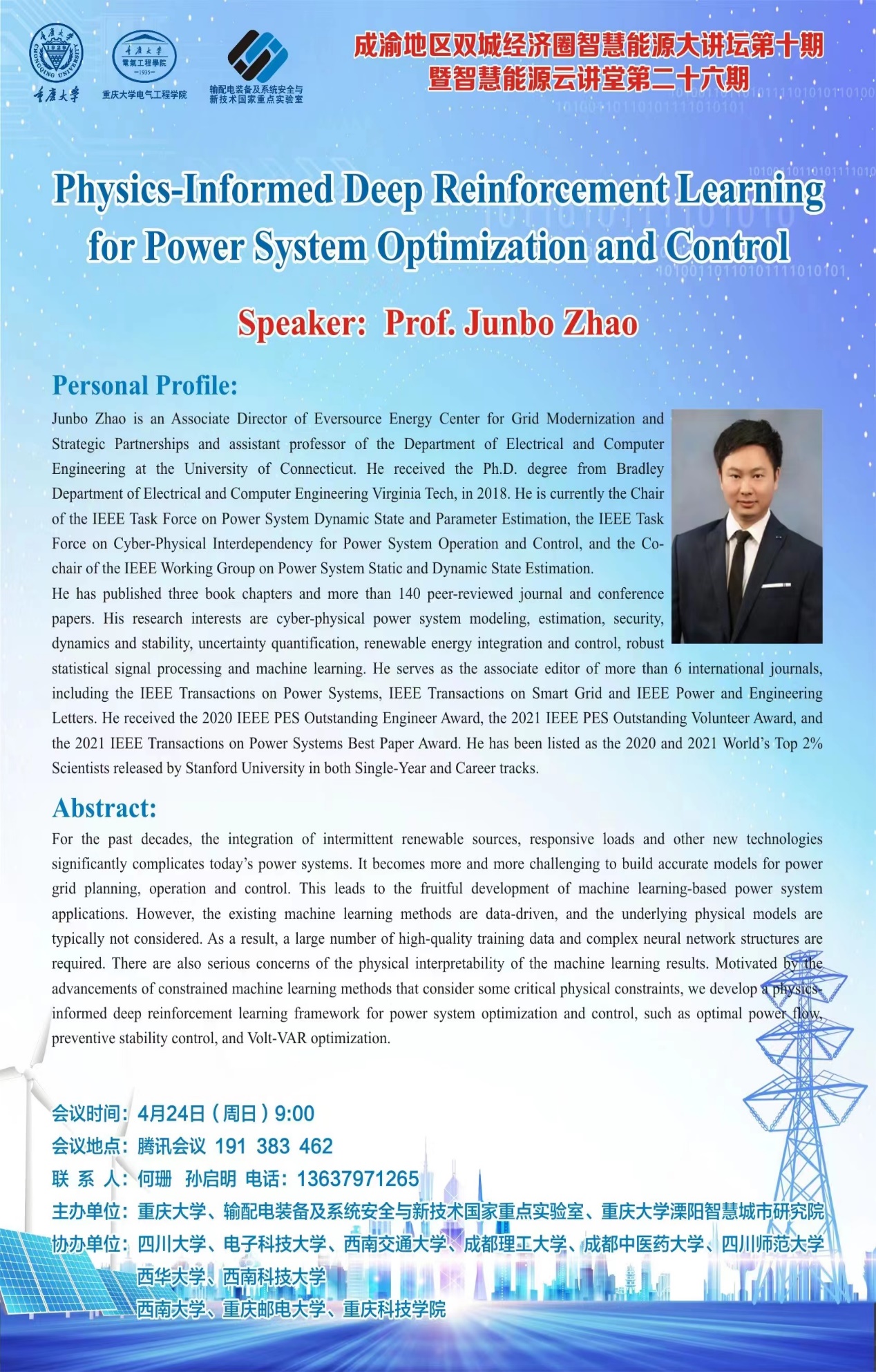 报告主题:Physics-Informed Deep Reinforcement Learning for Power System Optimization and Control