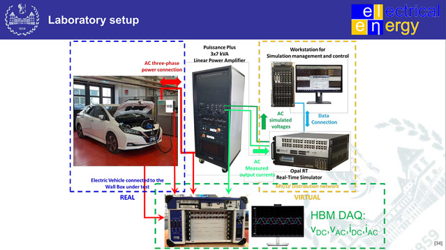 Enrico Pons教授在讲座中首先针对“系统如何从正弦稳态A移动到正弦稳态B”的问题进行了电磁暂态分析,并讲述了针对这种瞬态的3种最为流行的研究方法和求解步骤。然后引入了实时仿真的方法,其可以通过连接硬件在环配置中的真实电子设备进行更完整和持续的测试。会上,Enrico Pons教授展示了都灵理工大学能源中心实验室的实时RTDS模拟器。最后,针对电动汽车接入配电网进行“快速调频、稳压、调峰”等操作对配电网的影响问题,Enrico Pons教授分析了一个V2G的实际案例,借助实时仿真和电源硬件在环,研究了V2G和G2V两种范例对微电网能源社区的低压电网部分的影响。通过观察中压和低压母线上的电压分布、功率损耗注入网络的干扰功率因数、干扰对充电站本身的影响等主要参数,评估了多个双向充电站和电网之间的相互作用。研究此类操作对于大规模电动汽车接入电网时维持配电网的稳定性具有重要意义。