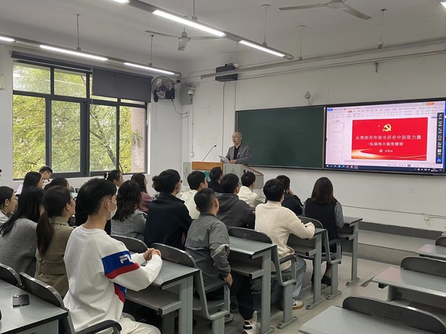郭忠林首先回顾了中国共产党的百年发展史,他谈到无产阶级政党的领导核心是组织上的核心领导者,更本质的应是思想上、政治上的“主心骨,中国共产党的成立意味着中国历史就此掀开了崭新一页。中国革命的残酷性,如大浪淘沙一般,淘汰率极高,全世界没有哪一个政党遭受过中共这般炼狱地火似的考验。其次他谈到中国共产党的初心和使命就是始终坚持将人民放在第一位,把人民对美好生活的向往作为奋斗目标,这是中共这个百年大党始终保持生机活力的源泉。纵观世界,像中国共产党这样长期执政并始终保持生机活力的百年政党并不多见。正如习近平总书记在党的二十大开幕式中讲到的:一个历经沧桑而初心不改的党,才能基业长青;一个铸就辉煌而自我革命的党,才能无坚不摧。新时代全党上下踔厉奋发、勇毅前行,为全面建设社会主义现代化国家、全面推进中华民族伟大复兴而团结奋斗,整装再出发集聚了精神力量。
