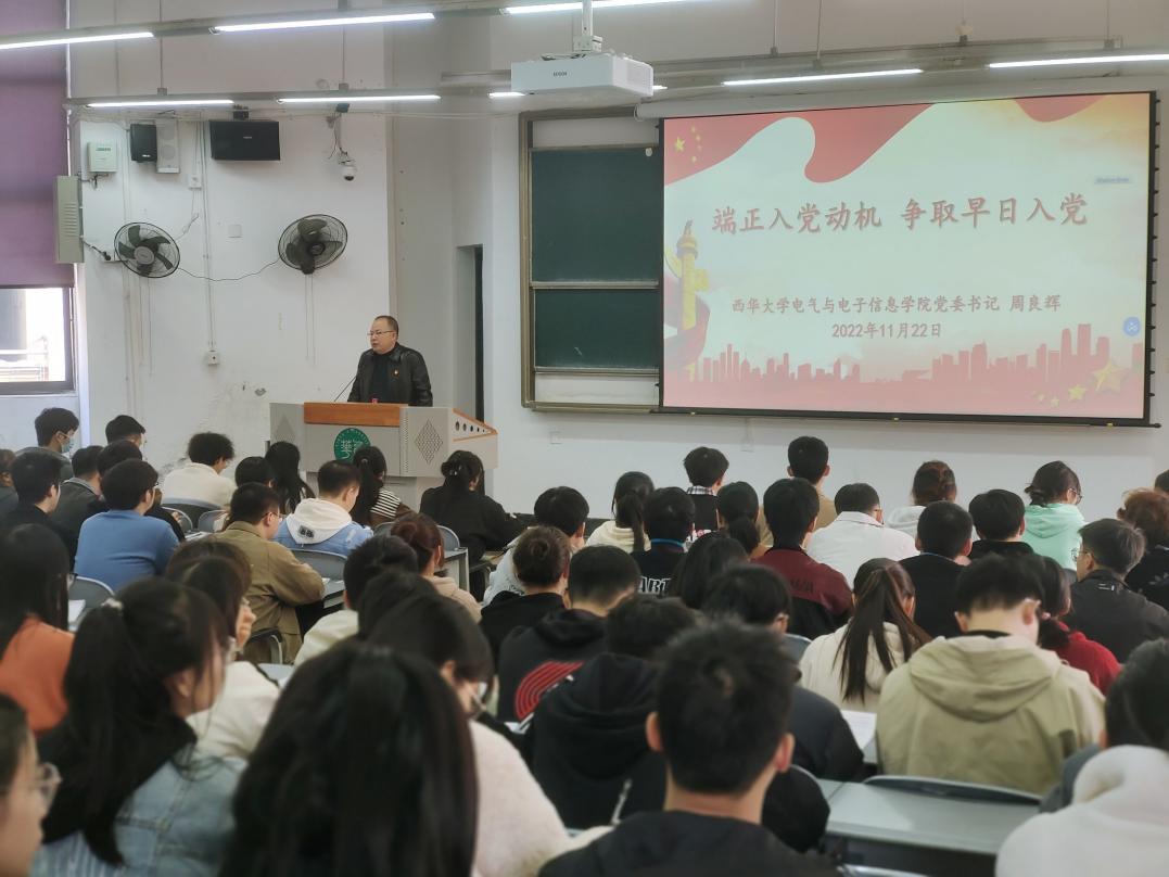 11月22日,伟德国际1946党委书记周良辉,以“端正入党动机、争取早日入党”为题,在6B-301教室为学院第49期党校入党积极分子培训班学员、发展对象培训班学员讲党课,共139位学员参加了本次党课学习。