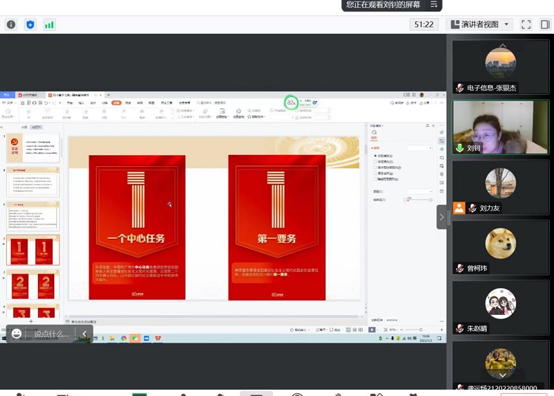 2023年1月3日,学工办主任刘钊为2022级研究生党支部同学进行了线上宣讲,以党的二十大报告中提出的“一个主题”为出发点,生动形象地为同学们展示了党的二十大精神的魅力。