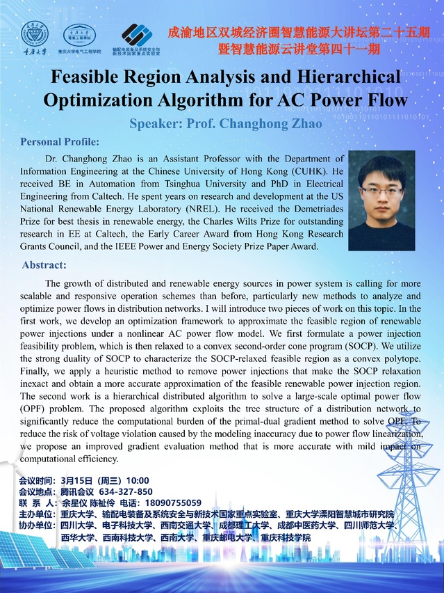 Dr. Changhong Zhao is an Assistant Professor with the Department. Of Information Engineering at the Chinese University of Hong Kong (CUHK). He received BE in Automation from Tsinghua University and PhD in Electrical Engineering from Caltech. He spent years on research and development at the US National Renewable Energy Laboratory (NREL). He received the Demetriades Prize for best thesis in renewable energy, the Charles Wilts Prize for outstanding research in EE at Caltech, the Early Career Award from Hong Kong Research Grants Council, and the IEEE Power and Energy Society Prize Paper Award.