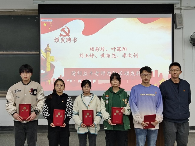 随后,郭忠林书记为第50期党校班长吴颜妍颁发聘书;刘益丰老师为第49期党校优秀班长王磊、优秀组长吴颜妍、邓博奇、张益铭、张艺菲颁发荣誉证书,为第50期党校组长杨彩玲、叶露阳、刘玉婷、黄绍尧、李文钊颁发聘书。