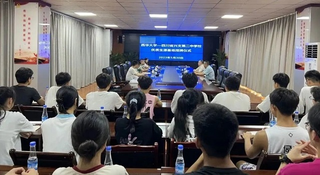 周良辉同志对兴文二中的办学成果表示肯定,对兴文二中向西华大学输送高质量人才表示感谢,介绍了西华大学的发展和前景,并向兴文二中授牌——西华大学优质生源基地。