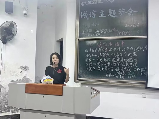 2023年6月6日晚,由2022级电气4班班委团组织的“树考风,正考纪”主题班会在6B-101召开,辅导员刘秀丽带领22级电气1-4班全体成员参加。此次班会旨在宣传我校优良的考风考纪传统,让每一位同学都了解到我校关于考风考纪的相关规定,力争做到以优良的考风,严明的考纪迎接本学期期末考试。